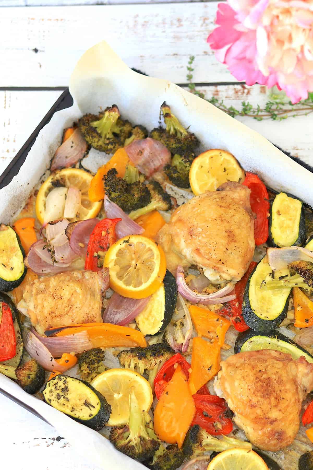 - STEP 4: Spread the vegetable mixture onto a lined baking sheet. Nestle the chicken thighs between the veggies. Bake for 30-35 minutes, or until the chicken reaches 165°F (74°C) and the vegetables are nicely roasted.