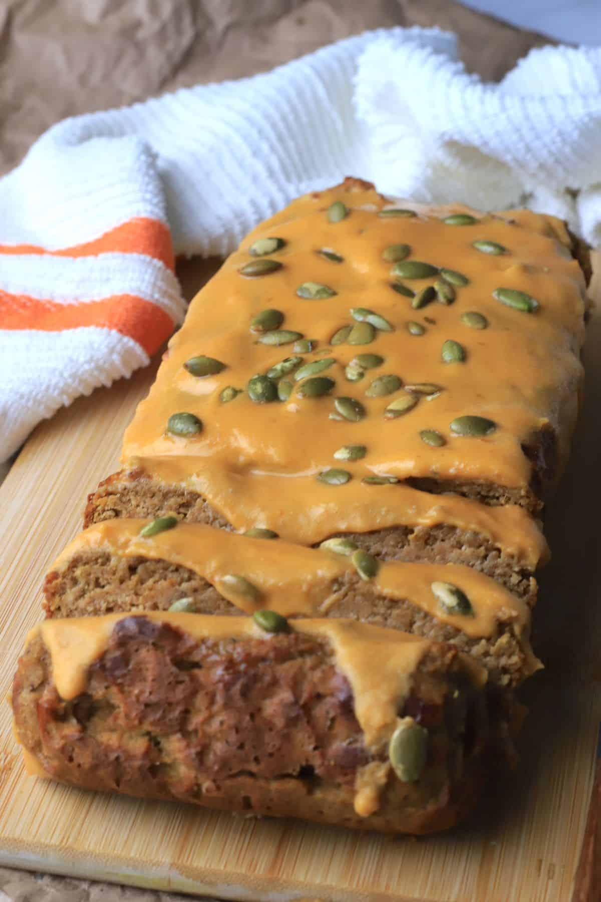 STEP 4: Whisk together the glaze ingredients and once the loaf is cooled, pour over the top and smooth out with a spatula. Optional: sprinkle the top with pumpkin seeds for some crunch.